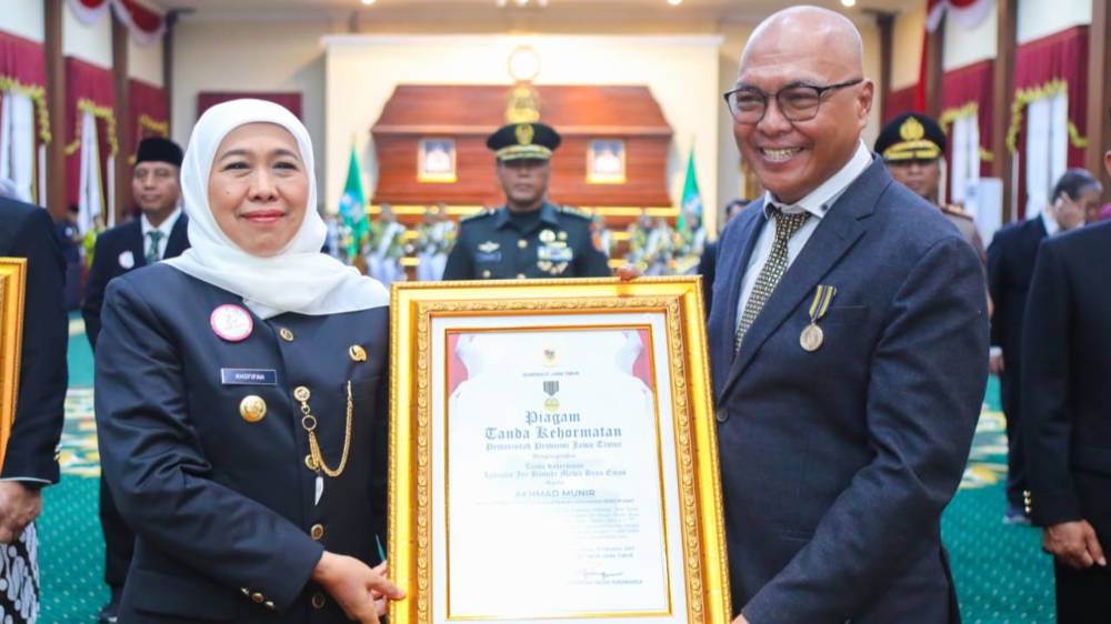 POSTWARTA.COM – Ketua Umum Persatuan Wartawan Indonesia (PWI) Pusat, Akhmad Munir, menerima Lencana Kehormatan Provinsi Jawa Timur “Jer Basuki Mawa Beya” pada puncak peringatan Hari Jadi ke-80 Provinsi Jawa Timur di Gedung Negara Grahadi, Minggu (12/10/2025). Penghargaan diberikan berdasarkan Keputusan Gubernur Jawa Timur sebagai apresiasi atas jasa dan prestasi Munir dalam memajukan pers nasional, memperkuat komunikasi publik, dan meneguhkan nilai-nilai kebangsaan, khususnya bagi masyarakat Jawa Timur.